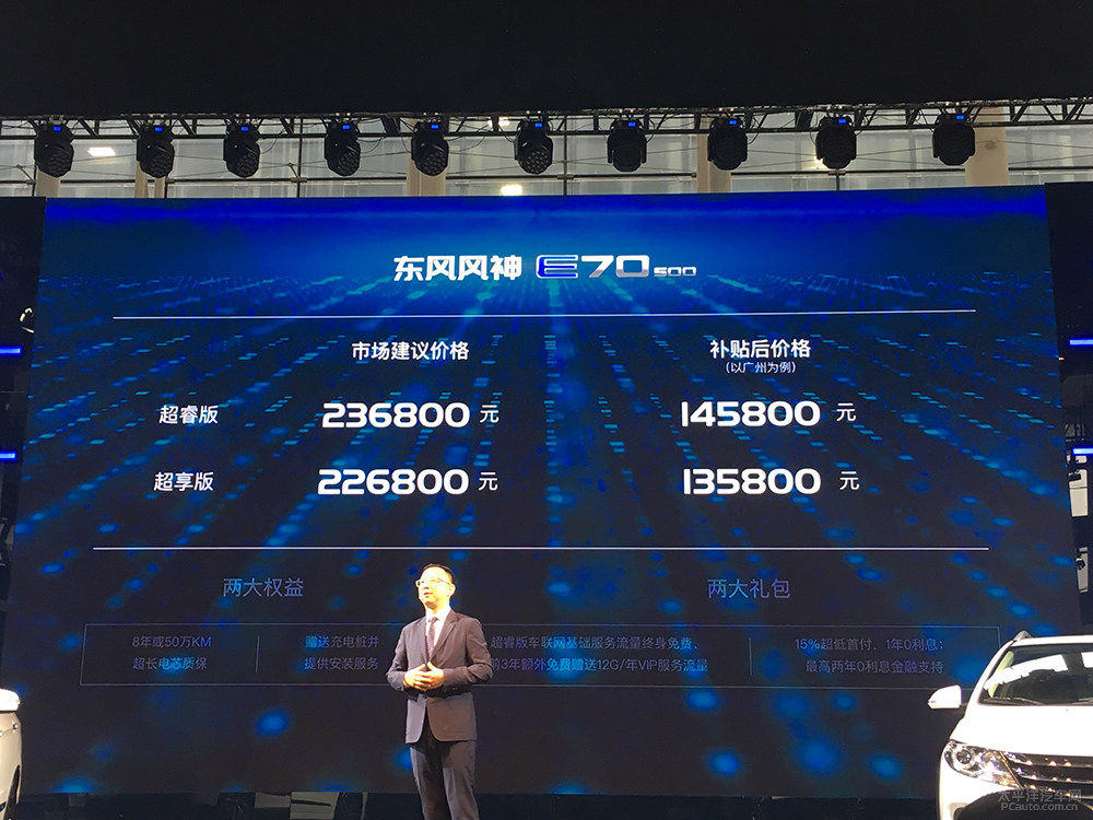 【尊流汽车网 新汽车频道栏目】东风风神主打产品纯电动车紧凑车E70 500在这届广州国际车展正式上市,新汽车共发布2款车系。超睿版具体指导市场价为23.68万余元,补助后市场价14.58万余元。超享版具体指导市场价为22.68万余元,补助后市场价13.58万余元。新汽车外型与该款E70基本相同,关键提升续航能力,充电电池单个能量密度210Wh/kg;60km/h等速工作状况较大里程数550km。