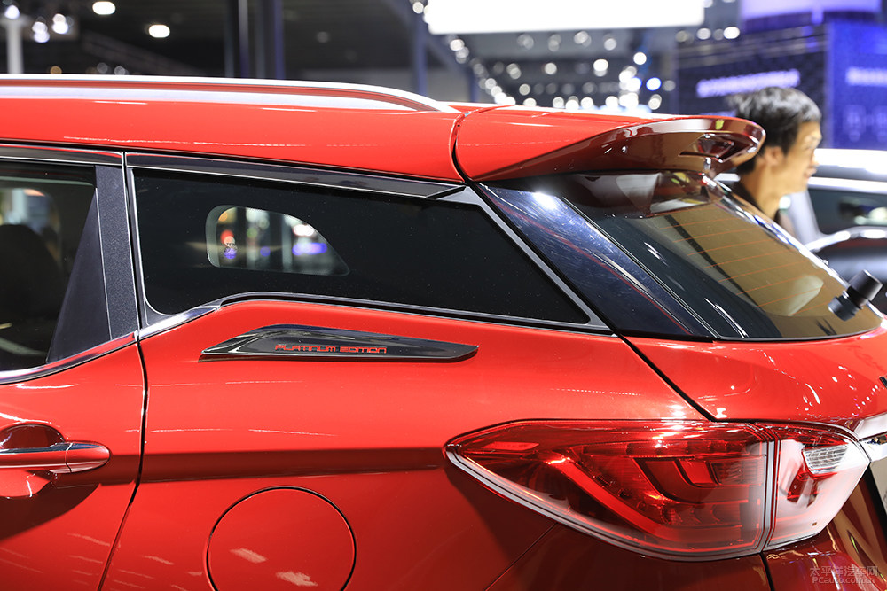 车体侧边,新汽车在B\C\D柱均选用亮黑色喷涂,构建出了当下时兴的升降式车子顶部款式。而坐落于车体正下方的亮深灰色包围着,则给此车增加了一丝硬派越野车范。挨近后尾不锈钢装饰条上能够 看到PLATIUM EDITON的字眼,说明其纪念版的真实身份。