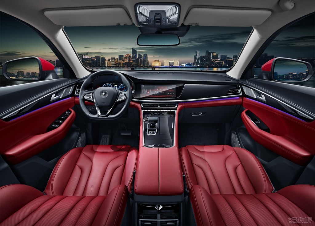 从图上看来,CS85车内饰选用了黑与红的拼色色彩,配搭上灰黑色钢琴漆中控台装饰板和不锈钢饰条,总体炫酷时尚潮流。在安全驾驶位,安装了三辐式智能汽车方向盘和全液晶显示屏仪表盘,而周围拥有 一块尺寸较大中控台液晶显示屏,适用互连等方便快捷作用,显示屏正下方齐整的排序有空调风口、操纵功能键等。除此之外,此车还选用了游船式挡把造型设计,雅致十足。