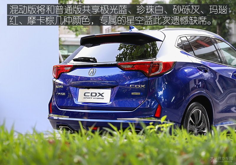 从外型看来,基础找不到混动版本CDX与一般CDX的差别,前杠正下方选用与车体同色系的设计方案,别的的在后尾及其翼子板一部分提升了混合动力专享标签贴纸。CDX混动版将撤销灰黑色,以增加一款专享的紫蓝色漆面供顾客挑选。