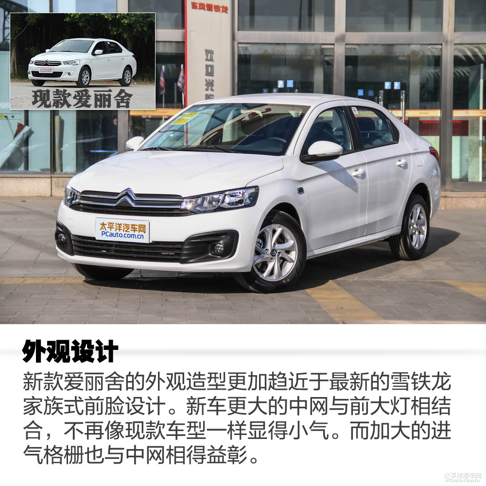 2017款全新爱丽舍在造型设计上拥有比较显著的转变,时尚潮流感更足。新款汽车在前脸的设计方案上更趋向东风雪铁龙家族化的设计风格,与头灯相接的不锈钢进气格栅看起来更大更宽,视觉冲击更优。正下方的进气口网也改成横着线框,进一步提高车前的视觉效果总宽。前雾灯部位添加了大规模的灰黑色装饰板,与正下方进气口网相接,全面性更强。尾端的设计方案选用更加圆滑的线框,与该款车系区别并不大,环回型后尾灯的设计方案颇具质感,且辨识度很高。