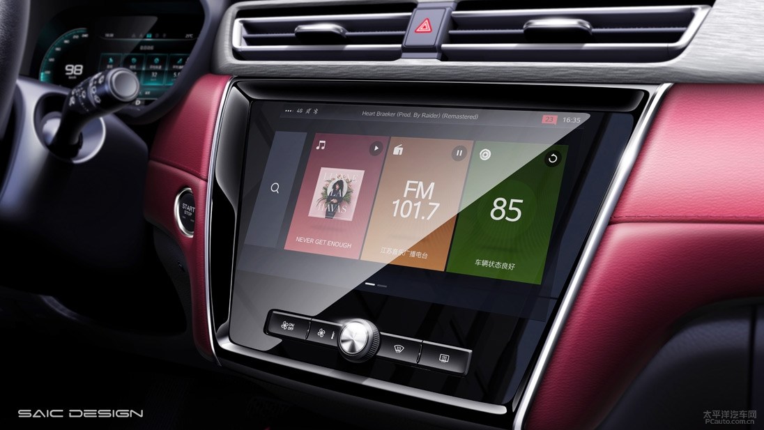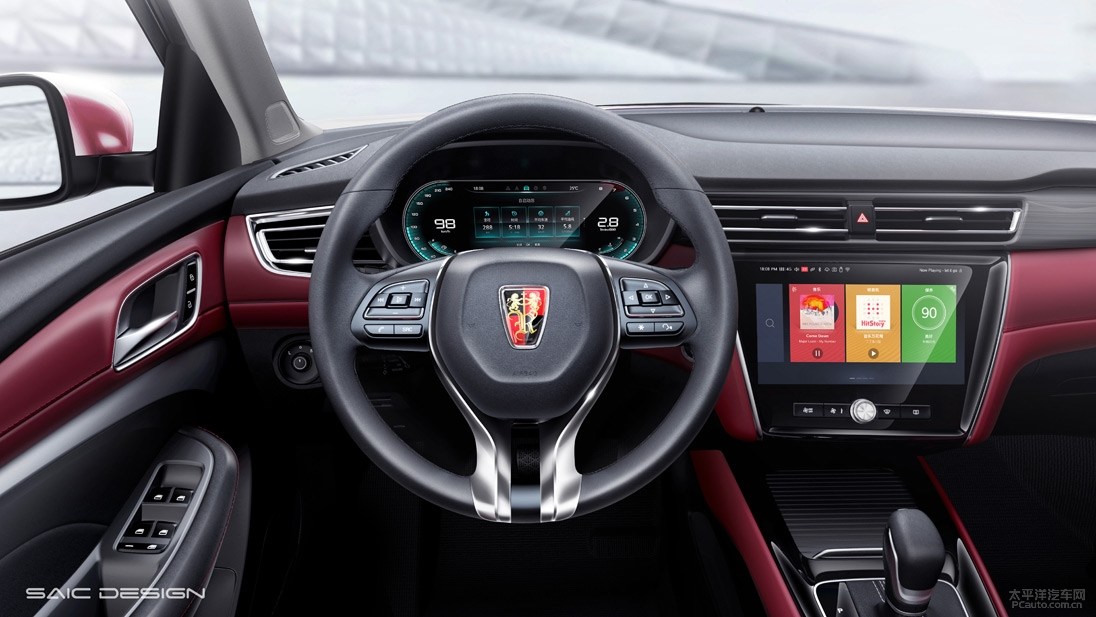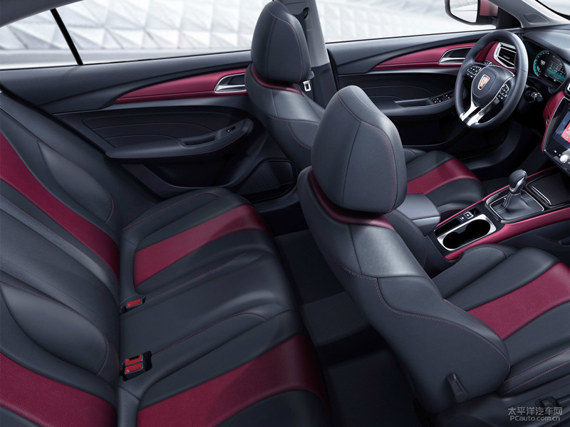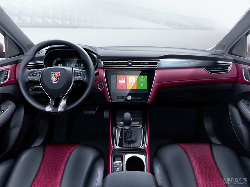 车内饰一部分,荣威i5选用当下时兴的鲜红色拼色设计方案,部分以不锈钢原素做为装饰设计。仪表台为环绕着式设计方案,边沿线框刻意装饰得十分炫酷顺畅,加上包镶式的尺寸较大中控台液晶显示屏和三辐式智能汽车方向盘,可以说速度感与现代感兼具。