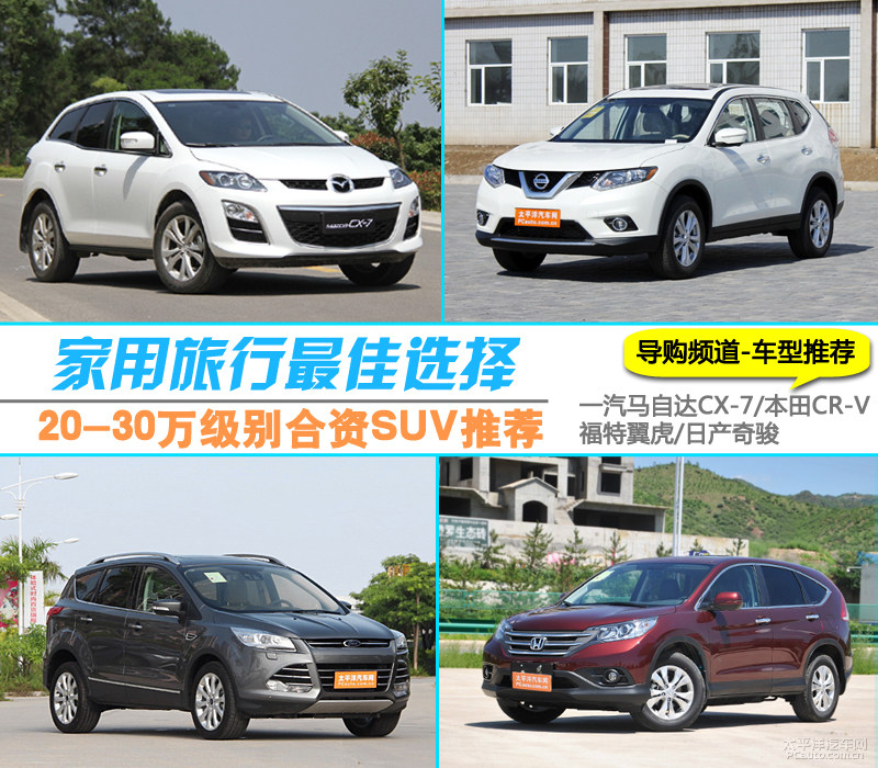 既然要兼顾家用和旅行,那么大空间和高离地间隙的SUV自然是首选,一汽马自达CX-7的上市在国内填补了20-30万SUV车型的空缺,并凭借着更低的入门价格,向众多主流SUV发起了挑战。本田CR-V虽然不再年轻,但每月的销量依然稳占前五之列,综合实力相当出色。福特翼虎作为途观的挑战者,各项高科技配置让其底气十足。而换代后的日产奇骏一扫老款硬朗的形象,更为圆润的外观线条很能迎合消费者的审美。
