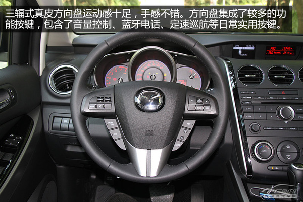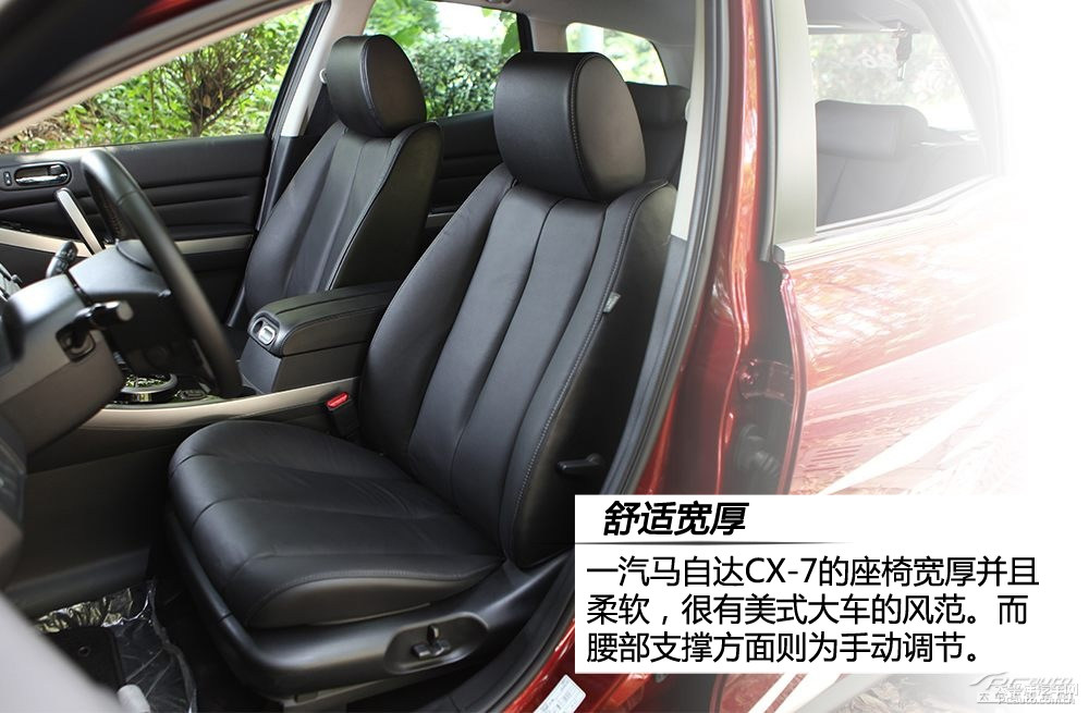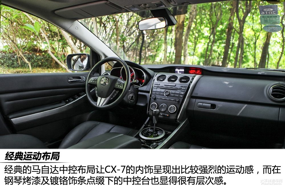 全黑内饰以及经典的马自达中控布局让CX-7的内饰呈现出比较强烈的运动感,而在钢琴烤漆及镀铬饰条点缀下的中控台也显得很有层次感。另外,配置方面也比较到位,包括氙气大灯、BOSE音响等主流配置也出现在CX-7的配置表上。