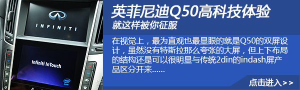 国产的Q50L实际上就是Q50的加长版车型,所以配置上沿袭了Q50的一套高科技装备,我们所推荐的悦享版上使用了下图这套双屏多媒体系统。