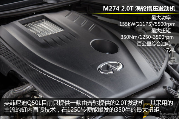 此前英菲尼迪Q50有三款动力选择,分别是3.7L V6自然吸气、3.5L V6混合动力和2.0T,而国产的Q50L只会使用一款2.0T发动机,该发动机并非进口Q50上的那一台,而是由奔驰提供的M274发动机,新一代奔驰C级(W205)中的C260L车型搭载的就是这款发动机,其最大功率155kW(211PS),峰值扭矩350Nm,搭配7AT,百公里综合油耗为7.4L,表现很不错。