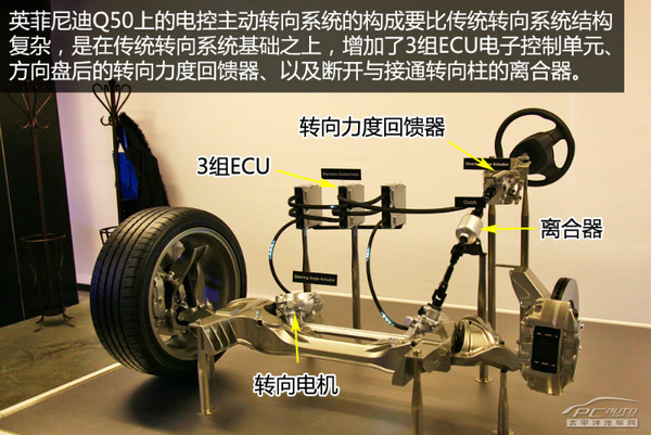还要提一提的是Q50L 运动版和豪华运动版上搭配的DAS线控主动转向系统,这项技术完全打破了现有的纯机械刚性连接结构,包括主流的电子液压转向和机械液压,取而代之的是一套类似于大家玩的PS3 GT5赛车游戏的纯电子模拟转向系统,通过方向盘转动发出模拟转向信号来驱动转向轮,不过这并非是DAS技术的瓶颈之处,毕竟通过一个简单的传感器便能完成。技术的瓶颈在于如何通过路面的路况和车辆的驾驶状态来回馈给方向盘的转向手感,这需要前期对各种路况以及包括飘逸、高速攻弯等激烈的驾驶模式信息的收集并实时转化、反馈。这项技术的优势在于驾驶乐趣的多元化,用户可以自行对转向系统进行设定,达到更加的线性或者更加的运动转向手感。