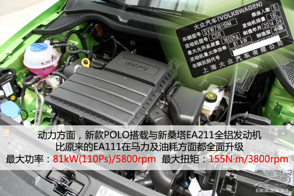 新车搭载EA211系列发动机(老款为EA111),其中1.4L发动机最大功率为66kW(90马力),相比现款增加4马力;而1.6L发动机最大功率81kW(110马力),相比现款增加5马力。同时,铝质的发动机重量更轻,操控油耗兼顾。当然还有GTI车型上的1.4T发动机,最大功率达到96kW(131马力),最大扭矩为220牛米。