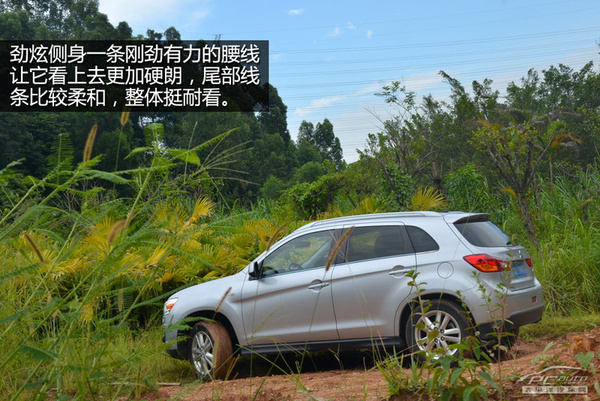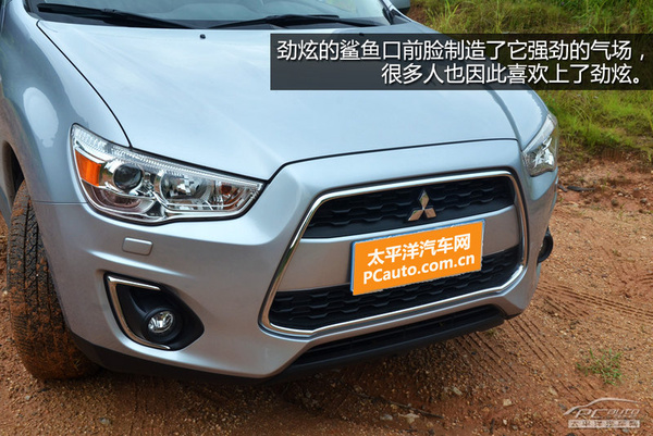 内置透镜的鹰眼大灯造型非常犀利,与三菱家族脸谱鲨鱼嘴搭配在一起,使劲炫ASX的前脸看上去凶狠霸气,很多人正是因为这样喜欢上了它。后保险杠离地间隙比较高,所以劲炫ASX有非常不错的离去角,在下坡时只需要注意车头跟地面的距离即可,车尾几乎没有任何危险。