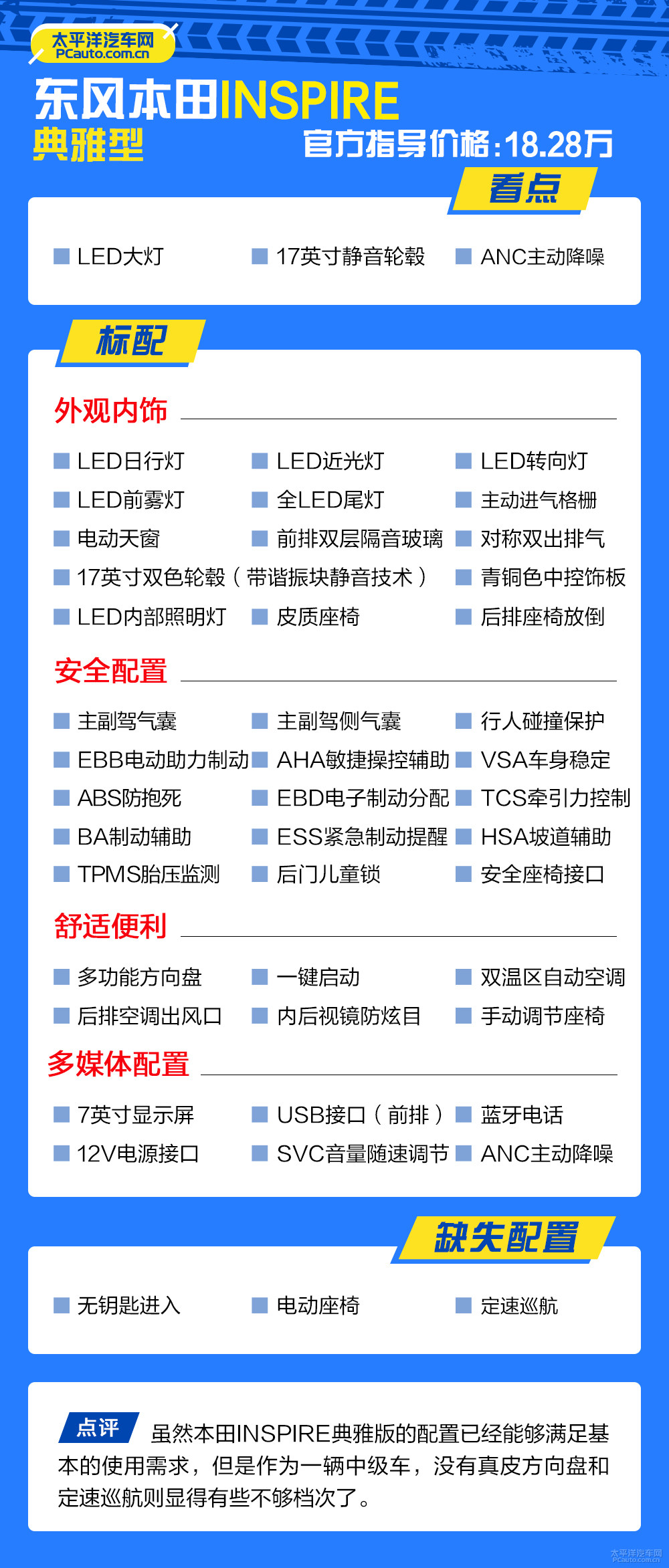 INSPIRE车型频道栏目 | 参配 | 照片 | 评价 | 社区论坛 | 代理商 店家价格:18.28~21.98万大量优惠促销> | 分期买车获得廉价 |