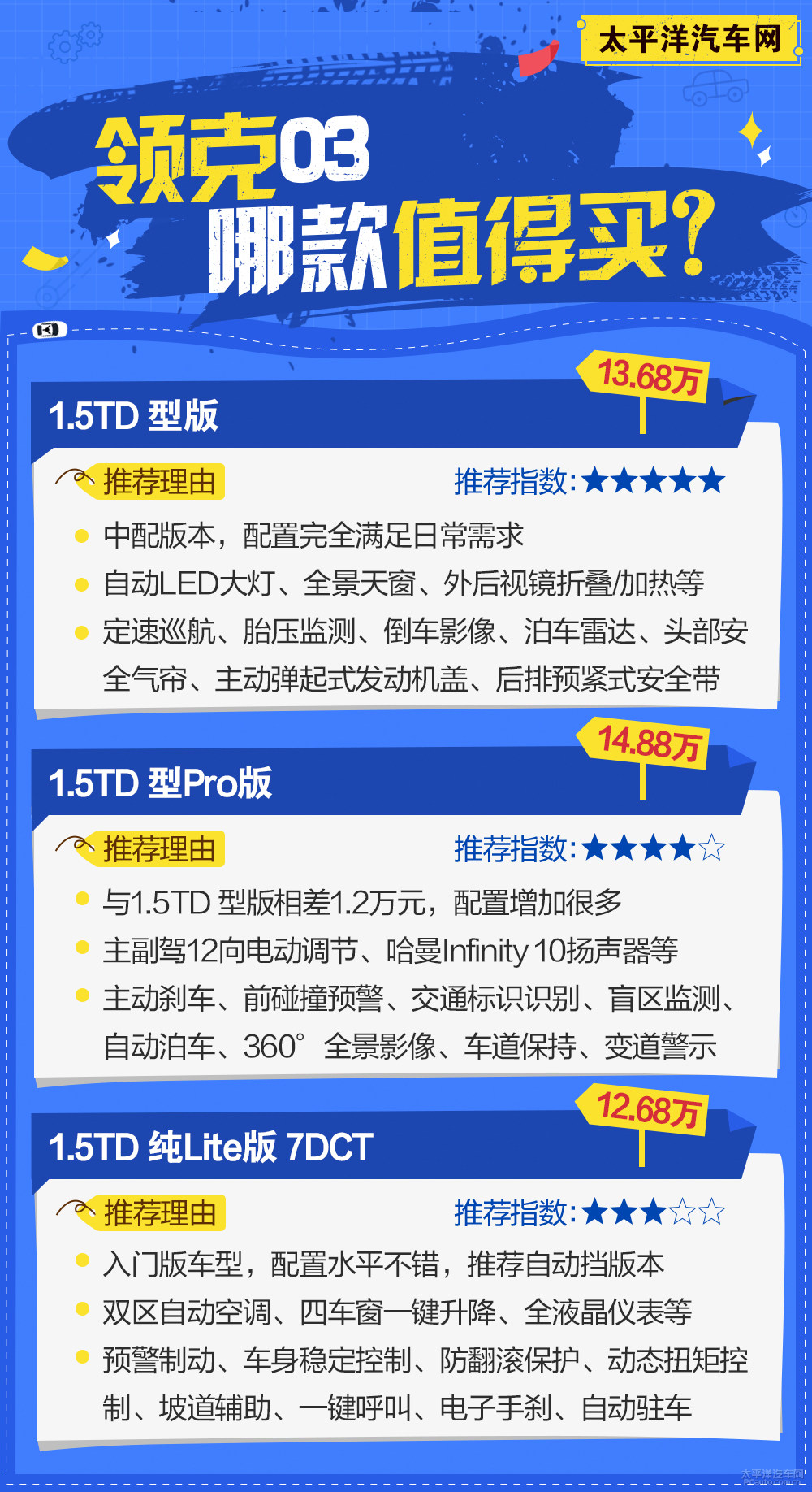 【尊流汽车网 导购员频道栏目】一款年青的车系不但要有漂亮的设计方案、丰富多彩的配备,也要有着安全驾驶快乐,愈来愈多不甘心于平平淡淡的年青人厌烦这些仅有舒服的车系,她们都憧憬着安全驾驶时要有热情、不低沉,因此时尚运动车慢慢遭受亲睐,10月19日发售的领克03就这样一款运动型轿车,那麼哪一个版本号最值得购买呢?下边大家就看来一下。