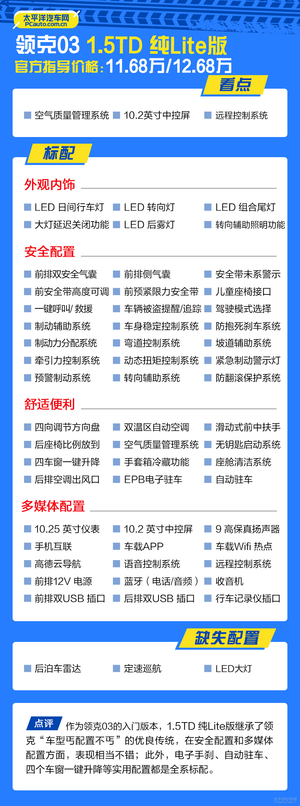 1.5TD 纯Lite版为领克03的新手入门版本号,出示6速手动变速器和7速双离合器变速器给顾客挑选,2个车系的配备是同样的,自动档汽车版本号贵一万元,小编觉得在二者选其一得话那么就自动档汽车吧,终究安全驾驶要更轻轻松松一些。