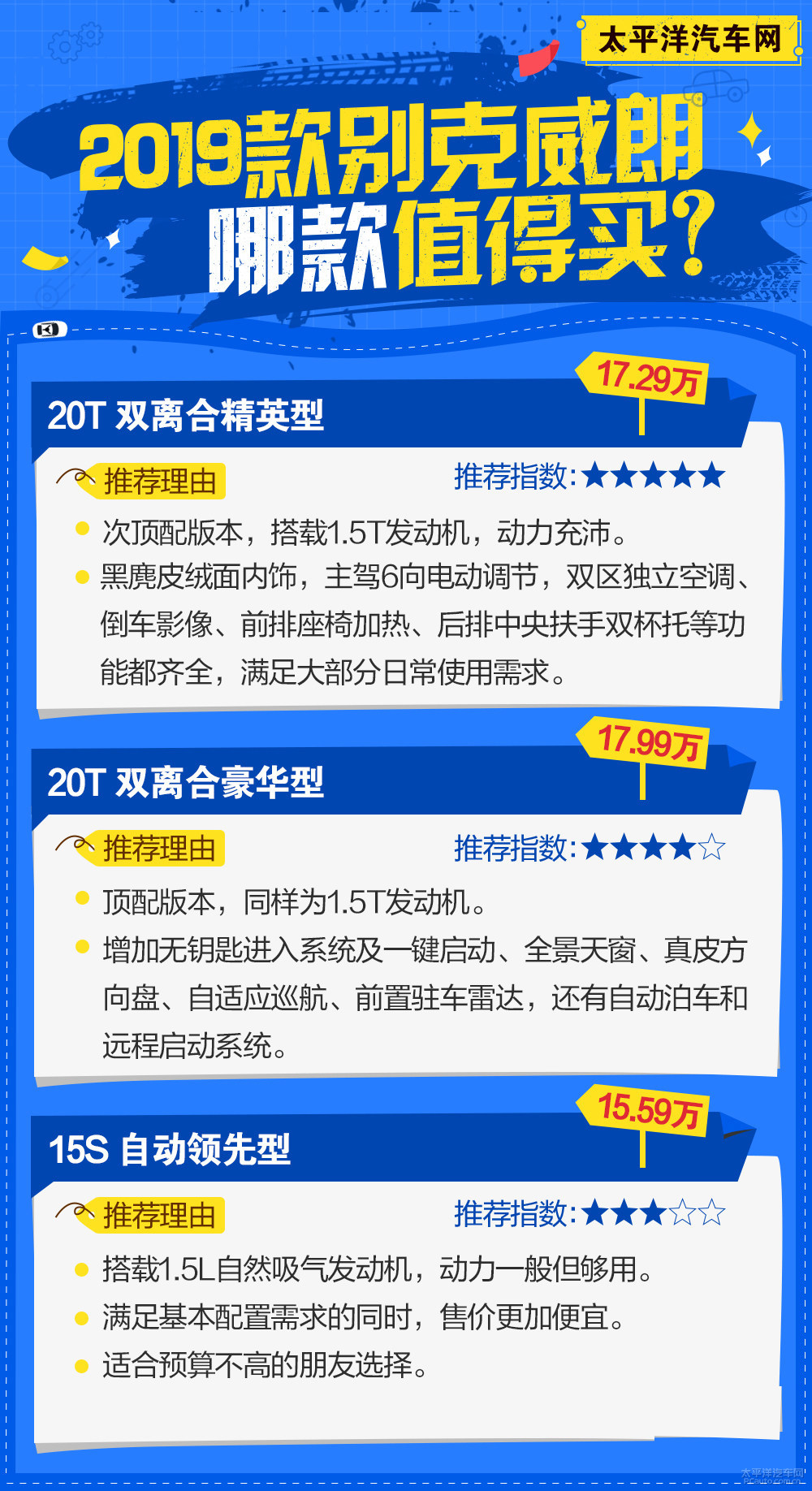 2019款别克威朗共发布5款车系,各自配用1.5L和1.5T柴油发动机,具体指导市场价区段为14.69-17.99万余元。(配图图片为2018款车系)