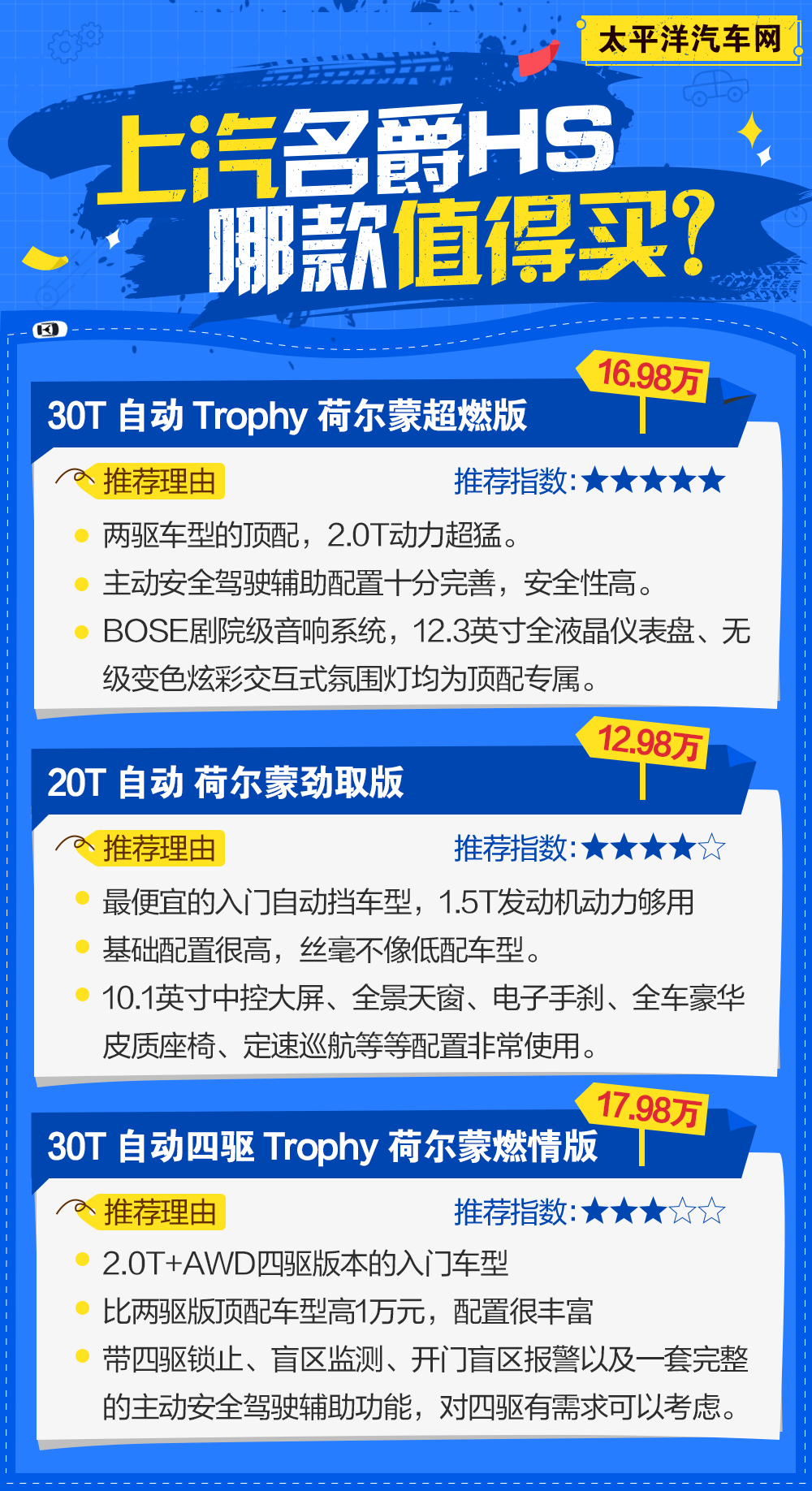 掌握完后,大家就先看一下名爵HS有那几种是最非常值得强烈推荐选购的,从后的配备剖析看来,两驱的高配车系无论是积极安全性功能還是别的奢华作用层面都很优异,价钱都不高,是更为非常值得强烈推荐的车系。