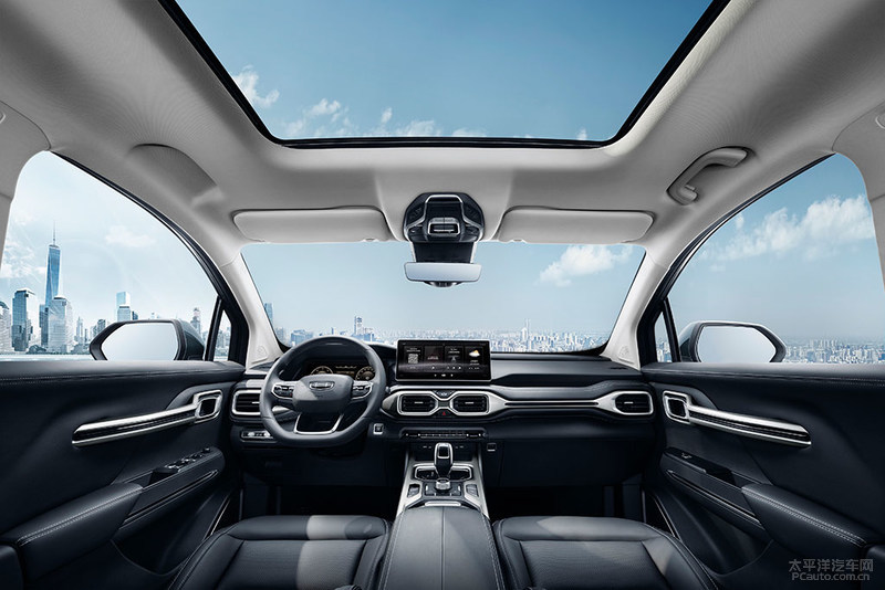 驾驶舱內部,升降式中控台大屏幕与电子器件挡把引人注意。车内饰围绕式设计方案的仪表台与“∞”造型设计的空调风口互相映衬,拉宽了豪越驾驶舱內部横着室内空间。中央政府安全通道则选用了好意头别具特色的两层设计方案,下方留出置物室内空间。