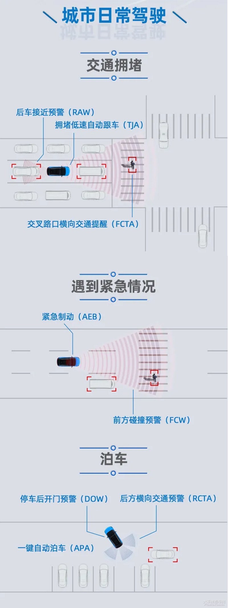ADiGO 3.0无人驾驶(需考虑特殊条件)系统软件在平时安全驾驶层面出示了车后贴近预警信息(RAW)、拥挤低速档全自动跟车(TJA)、交叉口横着交通出行提示作用(FCTA)、紧急停车(AEB)和正前方撞击预警信息(FCW)作用;在停车全过程中出示自动泊车系统(APA)、泊车后开关门预警信息(DOW)、后才横着交通出行预警信息(RCTA)作用。
