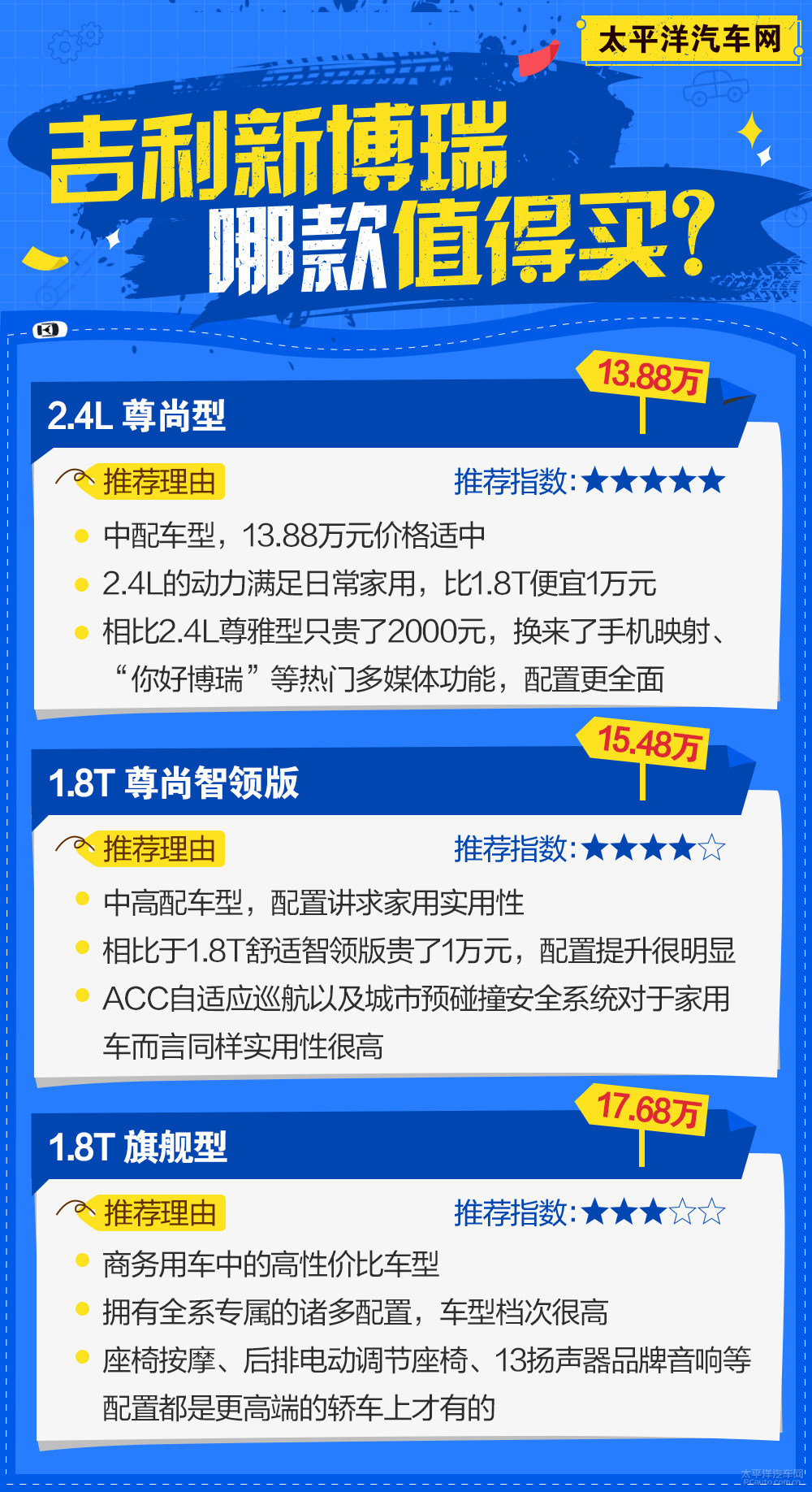 新博瑞在2017年发售时一共发布了10款车系,而就在2020年三月份,又发布了2款智领版车系,将全系列车系提升来到12款。这般巨大的车系管理体系针对顾客而言是件头疼的事,哪种车系最合适自身?哪种车系高性价比?比不上看一下大家的强烈推荐再做决定。