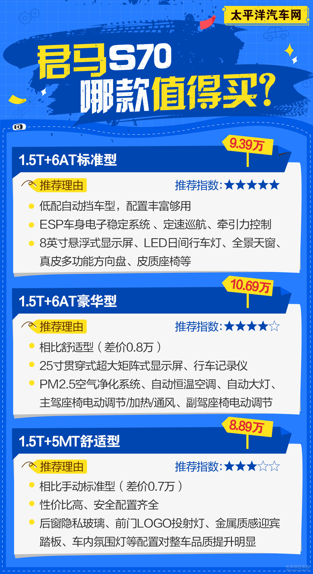 君马S70前不久正式上市,出示1.5T 5CT、1.5T 6AT,二种前脸(星芒式和聚流式的)总共13款车系可选,市场价区段8.19-11.59万余元,另外君马S70出示七年十五万千米质保期。