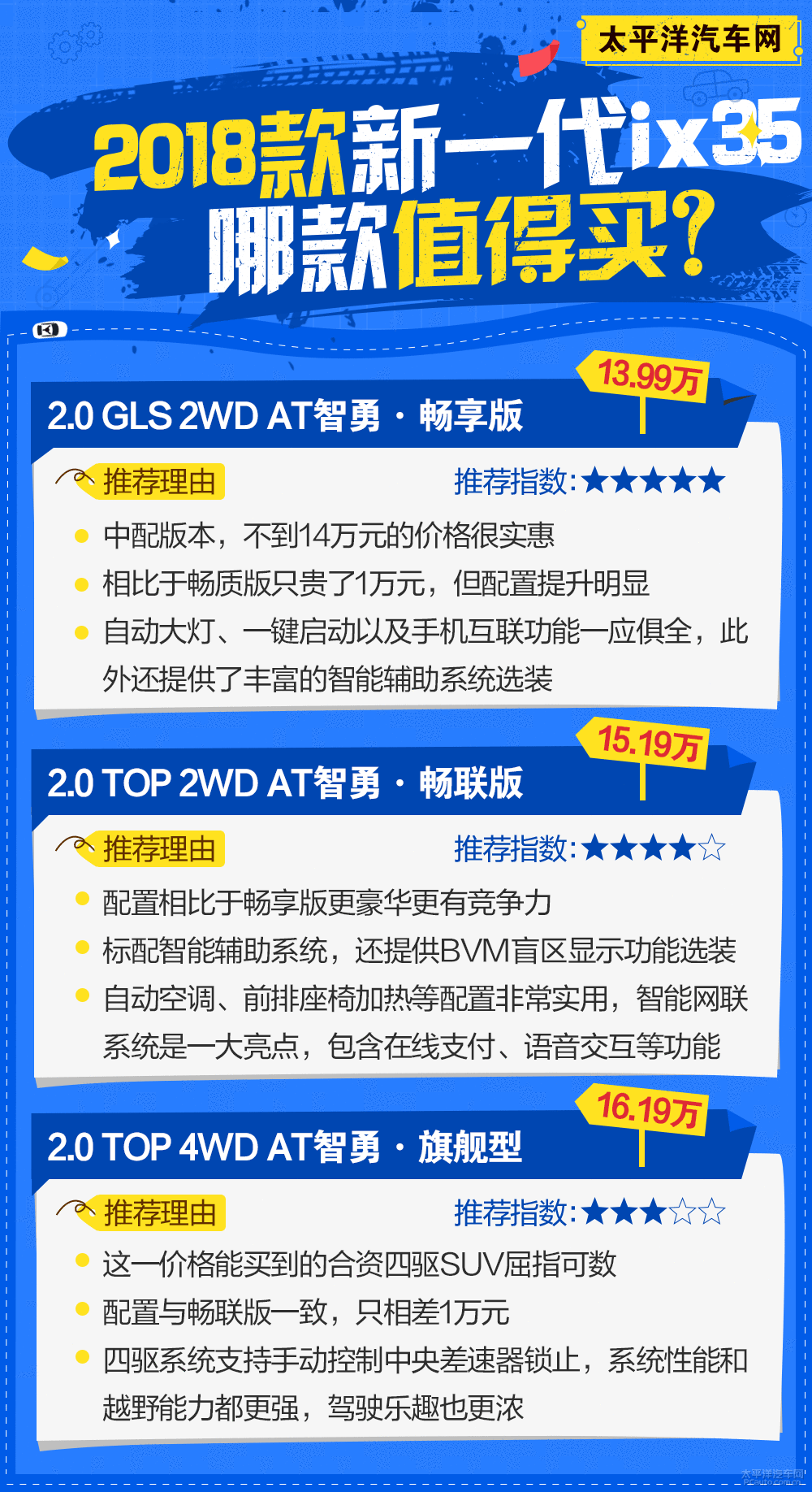 新一代ix35全系列共发布5款车系,包括一款高配的四驱车型。特别注意的是新一代ix35的价钱下降了许多,11.99万余元的起市场价可以用震撼描述了。很显而易见,新一代ix35更平价更性价比高,与全新途胜的价钱分开,在10-十五万区段内务求占有一席之地。注重性价比高的新一代ix35到底能有如何的性价比高主要表现?哪一款才算是最值得购买的车系呢?