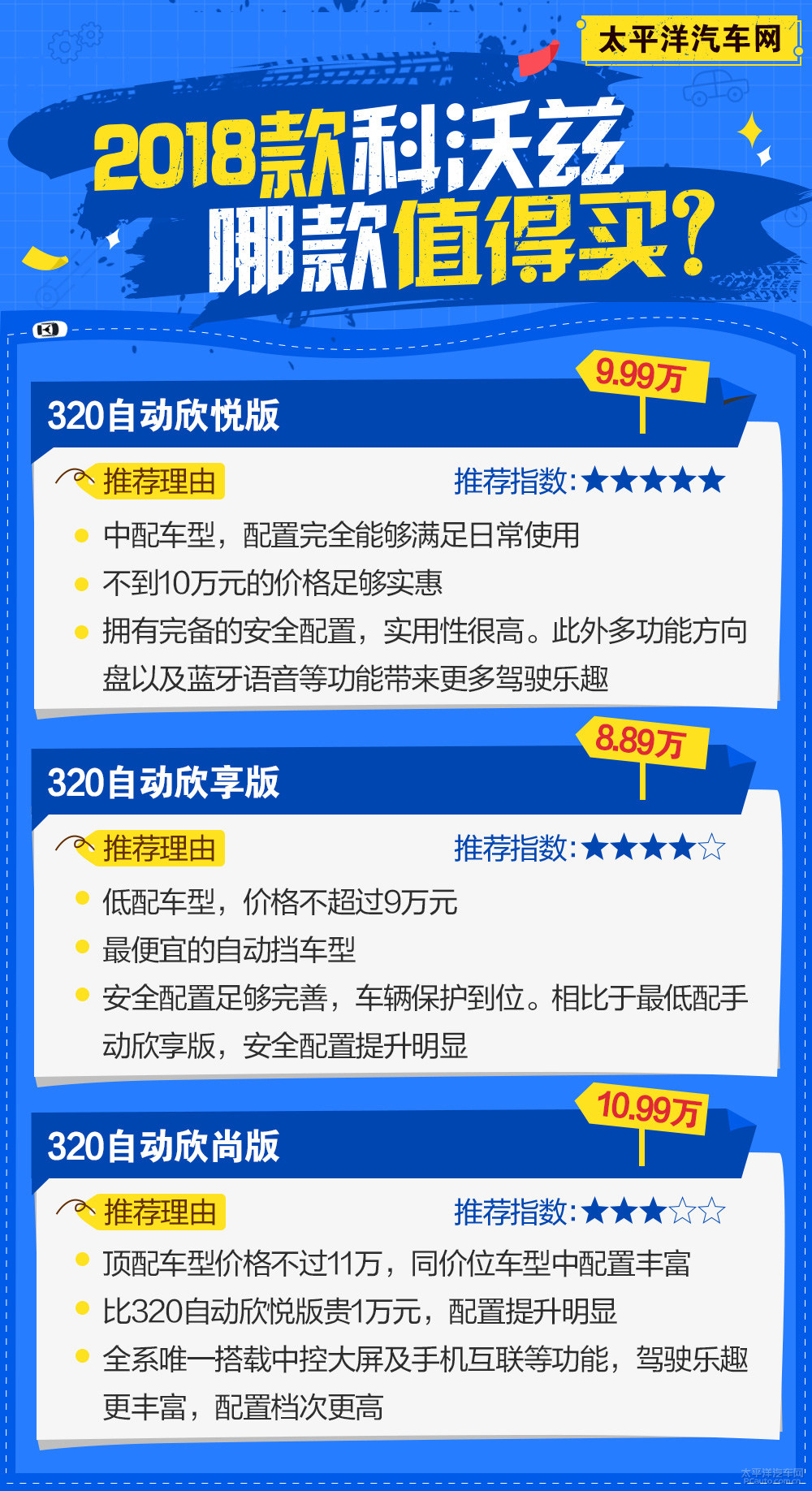 从上年发售后,不久前科沃兹迈入了第一次换代,来提高自己的竞争能力。2018款科沃兹全系列发布6款车系,价钱依然是以7.99-10.99万余元。全系列最大的变化是发布了一款欣享全景天窗版,促使标配自动档轿车也拥有自动天窗,这在旧款车系上是沒有的,由此可见新款汽车对于用户需求干了进一步的改善。