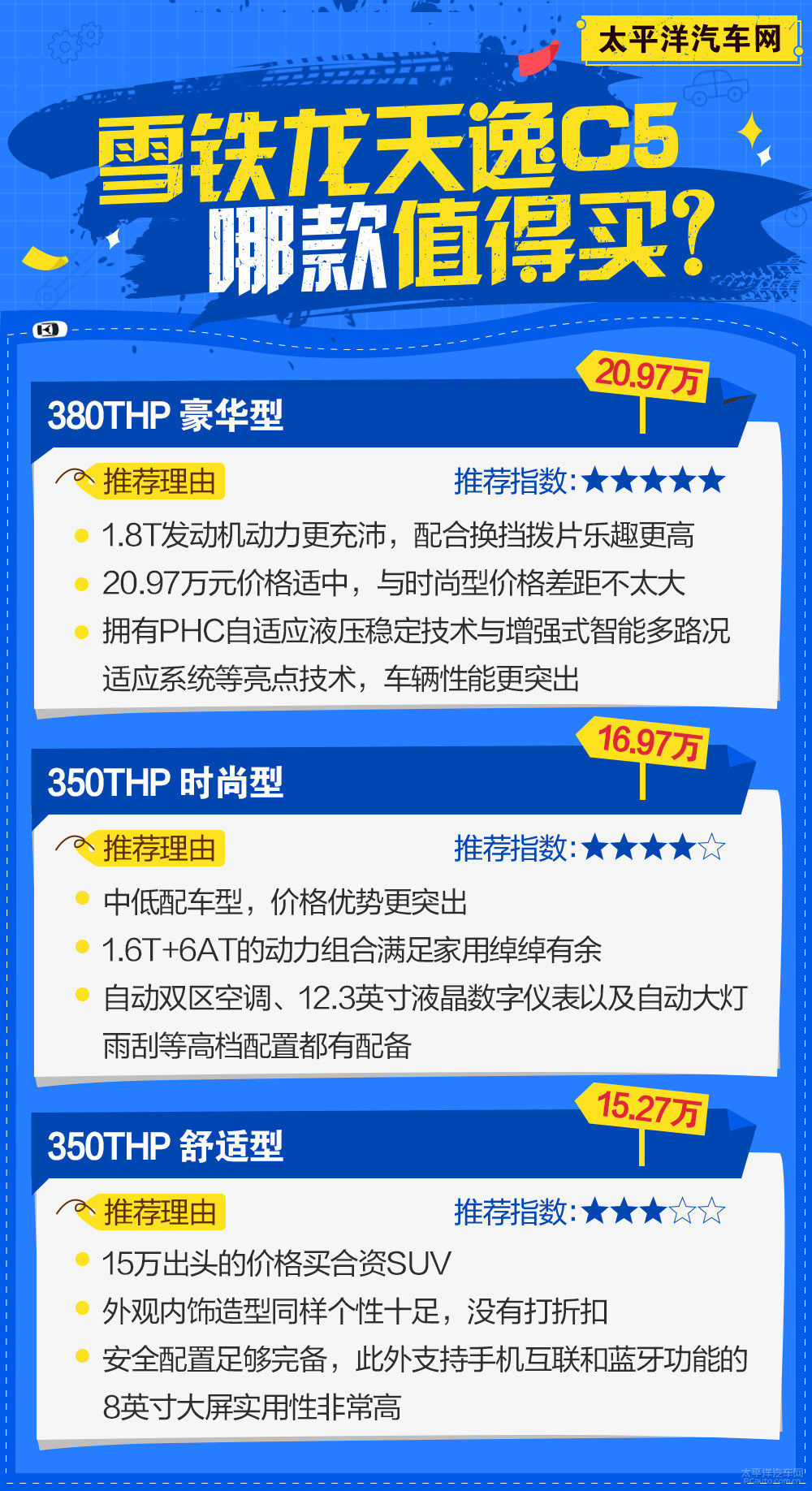 驱动力层面,天逸C5全系列配用1.6T和1.8T二种排气量柴油发动机,均配对6挡手自一体变速器。天逸C5的精准定位還是现代都市家庭装,从这一点而言实际上1.6T柴油发动机的主要表现早已非常合适了了,167PS的至大功率和245N·m的最高值扭距彻底考虑一个紧凑型级SUV的现代都市代步出行。假如要想更充足的驱动力,也有1.8T的车系来满足需求。尽管天逸C5表面看起来很健身运动,但全系列并沒有发布配用四驱系统的车系,并且后悬架依然选用扭力梁式非单独,一方面是东风雪铁龙对扭力梁的钟爱,另一方面也充分考虑室内空间等好用要素。值得一提的是中顶配车系添加了响应式液压机平稳技术性,因而不可以小瞧这套悬架组成。
