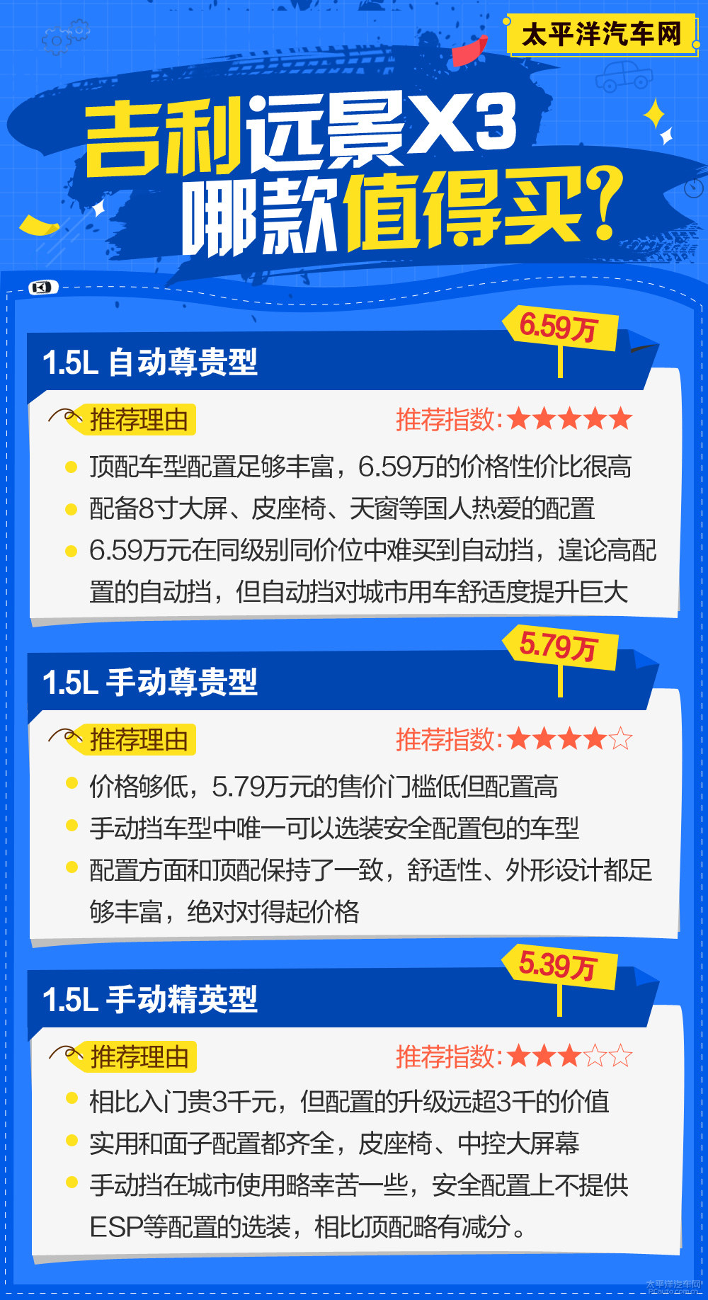 【尊流汽车网 新汽车导购员频道栏目】好意头2020年两新产品层出不穷,在全新升级的设计构思和加工工艺规范下,精典和爆品也是许多,非常是是在SUV行业,陆续打造出了博越、GS2款受欢迎车。而在中小型SUV行业,好意头在不久前的成都车展上也取出了自身的著作——发展前景X3。做为占领廉价销售市场的商品,发展前景X3共发布了5款车系,市场价区段5.09-6.59万余元,出示手动档和自动档汽车可选。那麼5款车系中到底谁最值得购买?使我们来一一做数据分析。