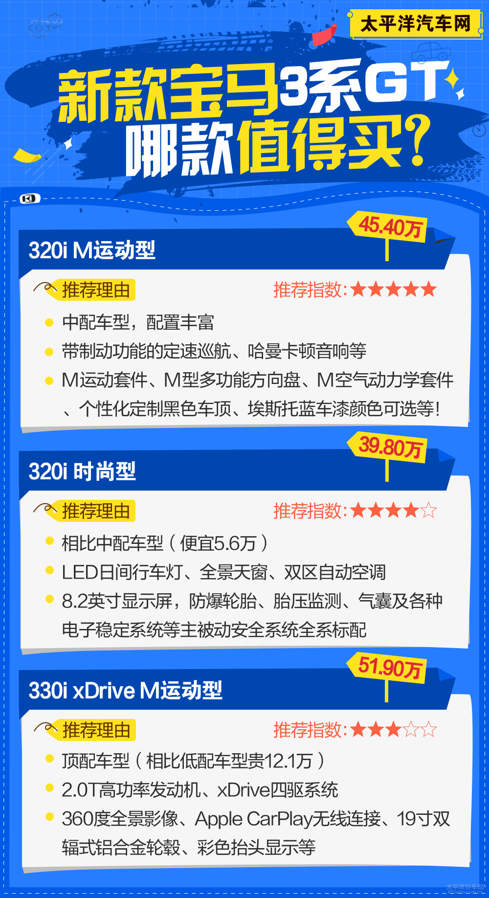 【尊流汽车网 导购员频道栏目】倘若有四十万的费用预算提前准备下手一辆宝马五系,你早已厌烦大街小巷的3系,又不愿应对旅行版3系提车身時间的等候,3系GT是一个非常好的挑选,个性化闲暇还更为好用。宝马三系GT自2014年发布至今,一直遭受销售市场五星好评,前不久,宝马旗下的最新款宝马三系GT正式上市,新汽车共发布四款车系,市场价区段39.8-51.9万余元。