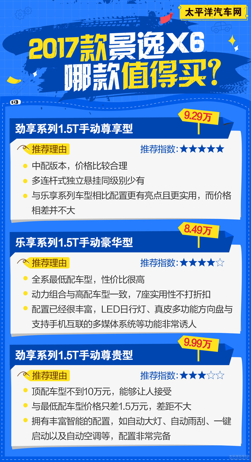 车风风行景逸X6一次发布了8款车系,这也很合乎自有品牌的一贯作法。8款车系价钱从8.49万至10.99万,由此可见每一款车系的价钱差并不大。全系列分成愉快享受和劲享2个系列产品,在其中愉快享受系列产品价钱更低,假如从配备视角来分得话全系列分成豪华版、悦享型和尊贵型三个级别,下面的配备剖析大家关键剖析每一个级别的配备差别。全系列配用2.0L和1.5T2款柴油发动机,在其中主推1.5T柴油发动机,配对5MT与CVT2款变速器。