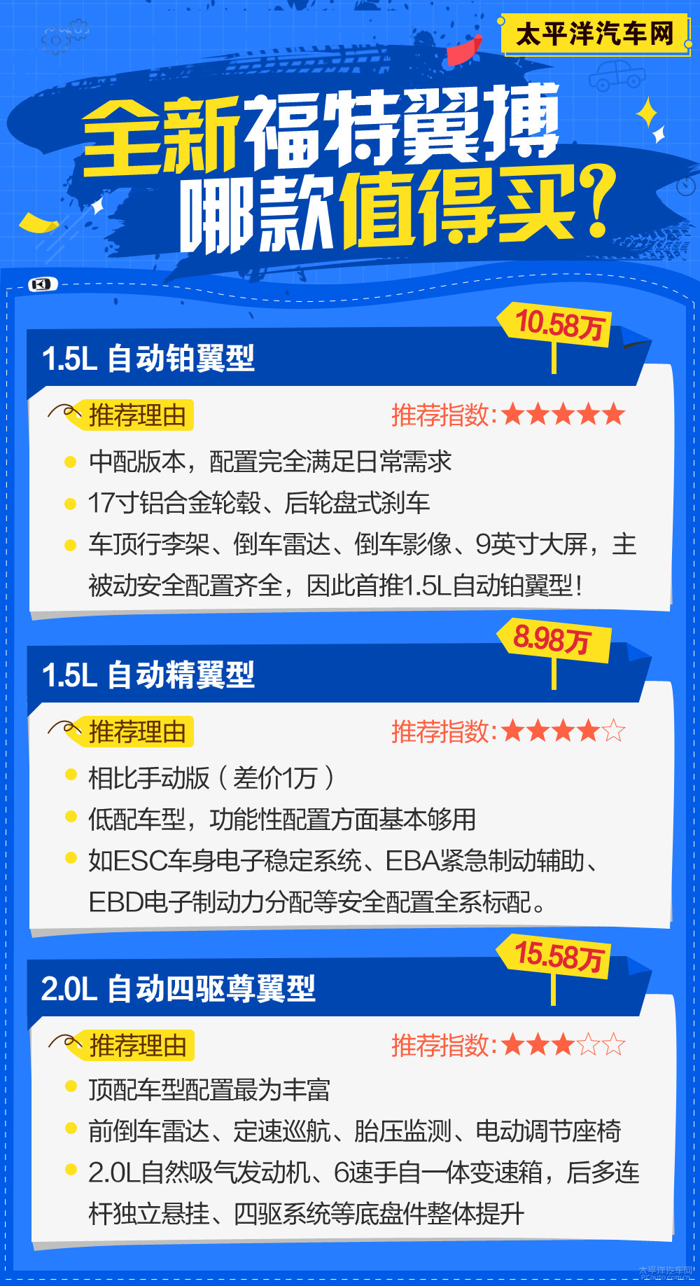 驱动力层面,全新升级福特翼搏配用1.0T、1.5L和2.0L三款柴油发动机,至大功率各自为92kW(128PS)、88kW(122PS)、125kW(173PS)。增加的2.0L车型将配对后独立悬架,并配对四驱系统。