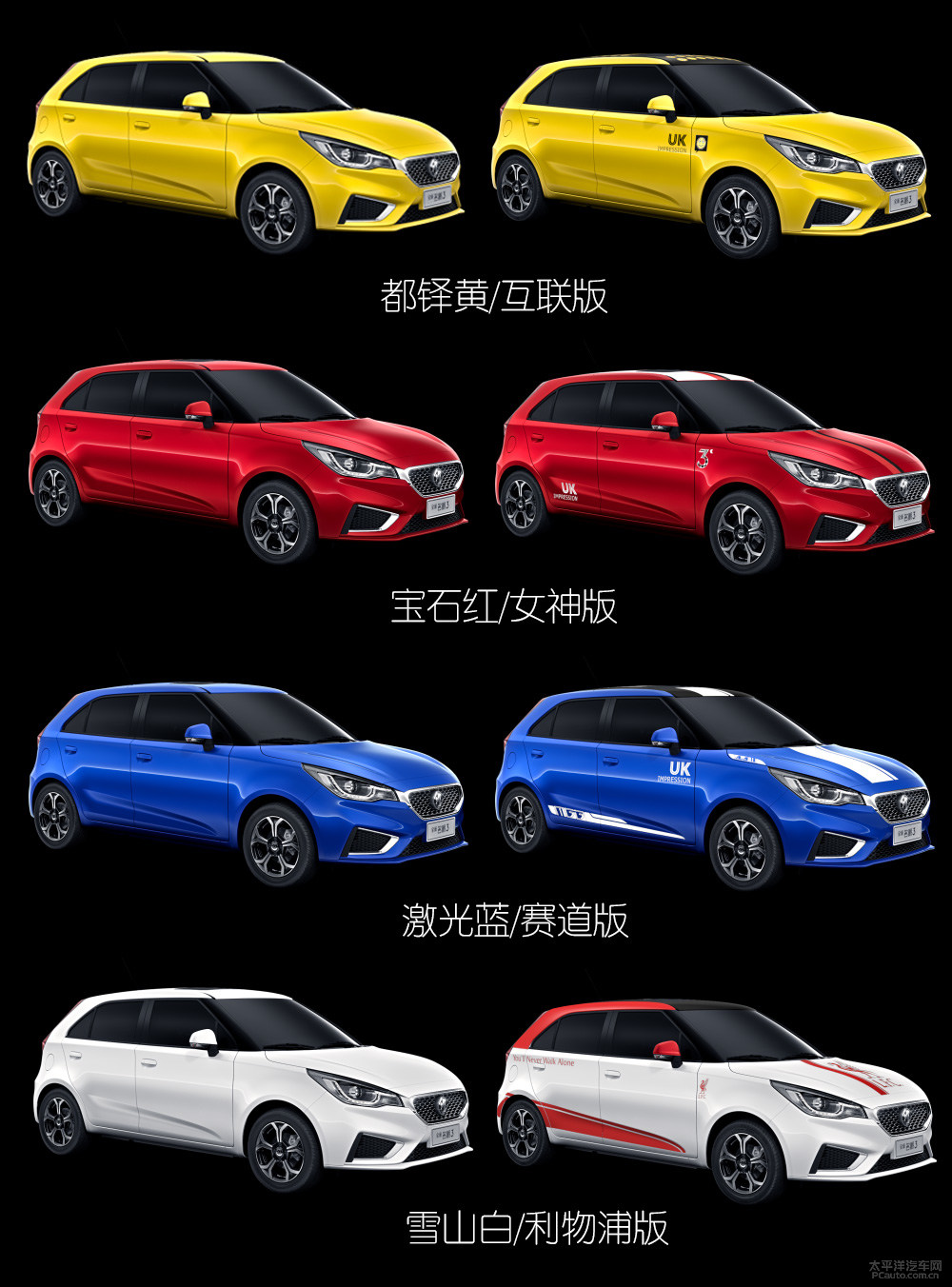 全新升级名爵3只出示了4种车体色调,但全是十分有魅力的色调,另外每一款色调相对发布了更有魅力的年青版本号,展示出了年青人钟爱的互联网技术、足球队与跑车等原素,除此之外也有考虑女孩爱好的女王版,十分有个性。