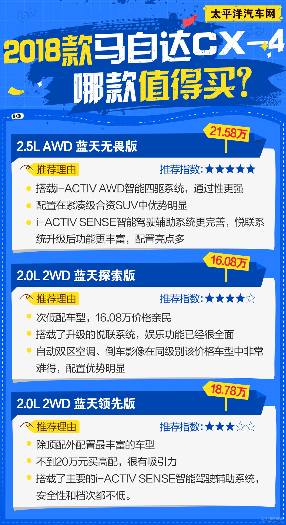 2018款马自达汽车CX-4全系列发布了7款车系,在其中最少配为手动挡轿车,而2款配用2.5L自吸柴油发动机的车系选用了智能化四驱系统。新款汽车在配备和操纵上拥有显著提高,GVC瞬时速度矢量素材自动控制系统的添加让马自达汽车CX-4更有话题,而新款汽车在价钱上与旧款维持了一致,由此可见新汽车的性价比高可能有一个很大的提高。