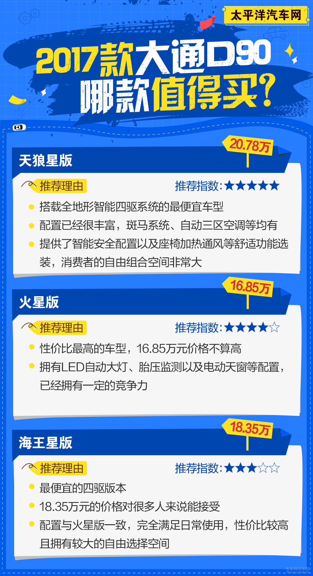大通汽车D90的8款车系从配备看来并没什么关系,每一款车系都出示了选配配备。此外驱动力组成的不一样也是危害价钱的一大要素。文中的配备及价钱剖析根据官方网出示的参考价,实际的配备选配及其最后价钱,还必须顾客自身去汽车4S店资询,这儿的剖析仅作参考。