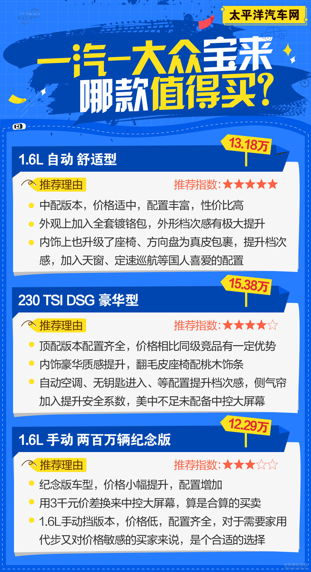 【尊流汽车网 新汽车导购员频道栏目】宝来在十几年前轿车還是“奢侈品包包”的时期,获得了很高的称赞,也是很多人的理想之车。而伴随着轿车的普及化,宝来也在追随时期持续发展趋势,如今的全新宝来已没了原先的样子,但全新升级的设计方案和更为舒服的家居特性使他依然是一台性价比高和层次感都很非常好的家用车。不久前全新宝来也发布了小换代的2017款车系,对全系列的配备都干了一次升級,并发布了二百万台收藏版、运动版2款新款车型,全系列车系总数做到了14款。这般多的车系中,哪种才最值得购买?使我们来一一剖析。