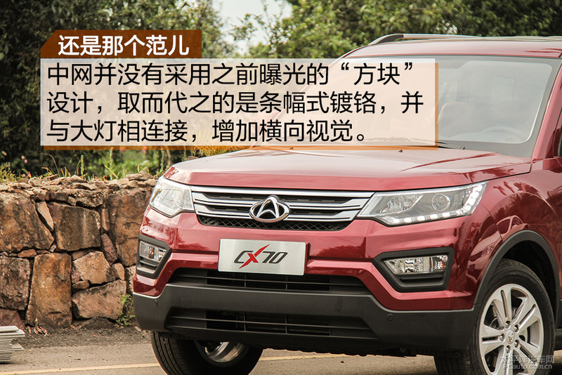 北京长安CX70的造型设计可以用空气粗犷来描述了。终究有着很大的车体规格,再再加四四方方的造型设计,粗犷设计风格比较突出。从脸照看去,横着的粗大线框让北京长安CX70极具硬汉子品牌形象,简约的双辐进气格栅与头灯连为一体,与正下方灰黑色的防刮刀相映衬,也并不感觉简单。侧卧线框一样十分颇具能量,轮眉处的突起设计方案全身肌肉感十足。