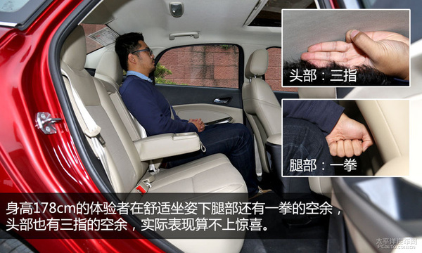 前后排室内空间的感受者为178cm,头顶部室内空间均为3指上下,前座调好座姿后,后排座脚部室内空间还有1拳多剩下,算不上压抑感。室内空间整体主要表现终于紧跟了流行,但依然未到前端环节。