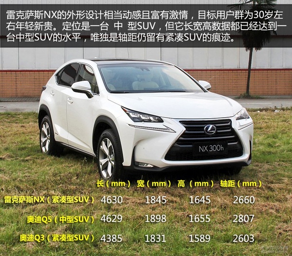 NX的身型紧凑型强有力,并且填满着明显的金属光泽和雕塑感,给人的第一印象很科幻片也很新鮮。绷紧的线框和关键点丰腴的轮廊产生明显的运动感,在规格上,NX对相比Q5和X3也不显小,除开轮距之外,尺寸占比都和流行竞争者类似。 (注:案例照片为高配版本号的NX300h)