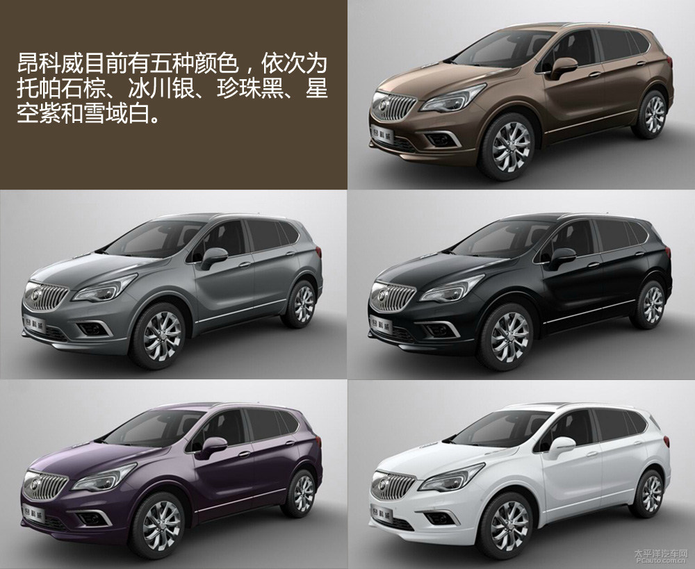 昂科威有五种车体颜色选择,分别是主推的深棕色和蓝紫色、灰黑色、深灰色、乳白色(点这儿官方网站查询色调),轮圈为17英寸和19英寸二种挑选。